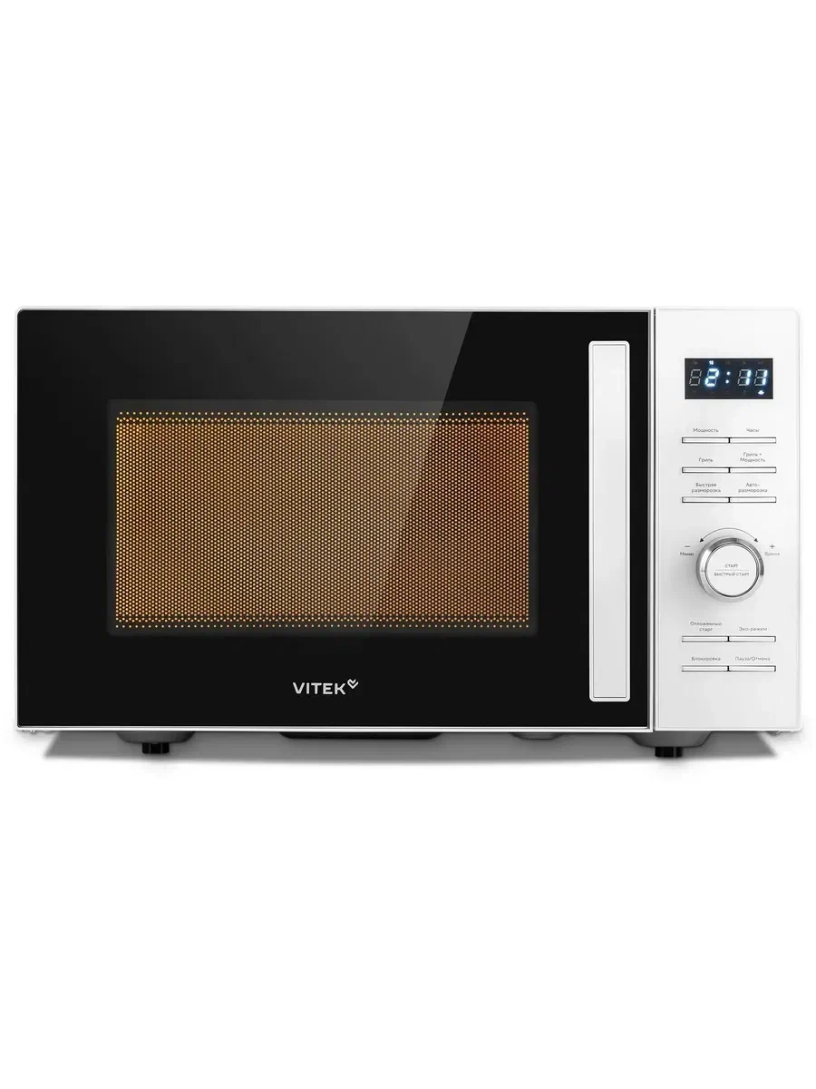 Микроволновая печь Vitek, объемом 25 литров, с грилем, мощностью 1000Вт., удобным управлением с помощью кнопок и вращающегося регулятора.