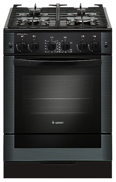 Новая, красивая газовая плита Gefest со стеклянной варочной поверхностью, чугунными решетками и газовым грилем в духовке.