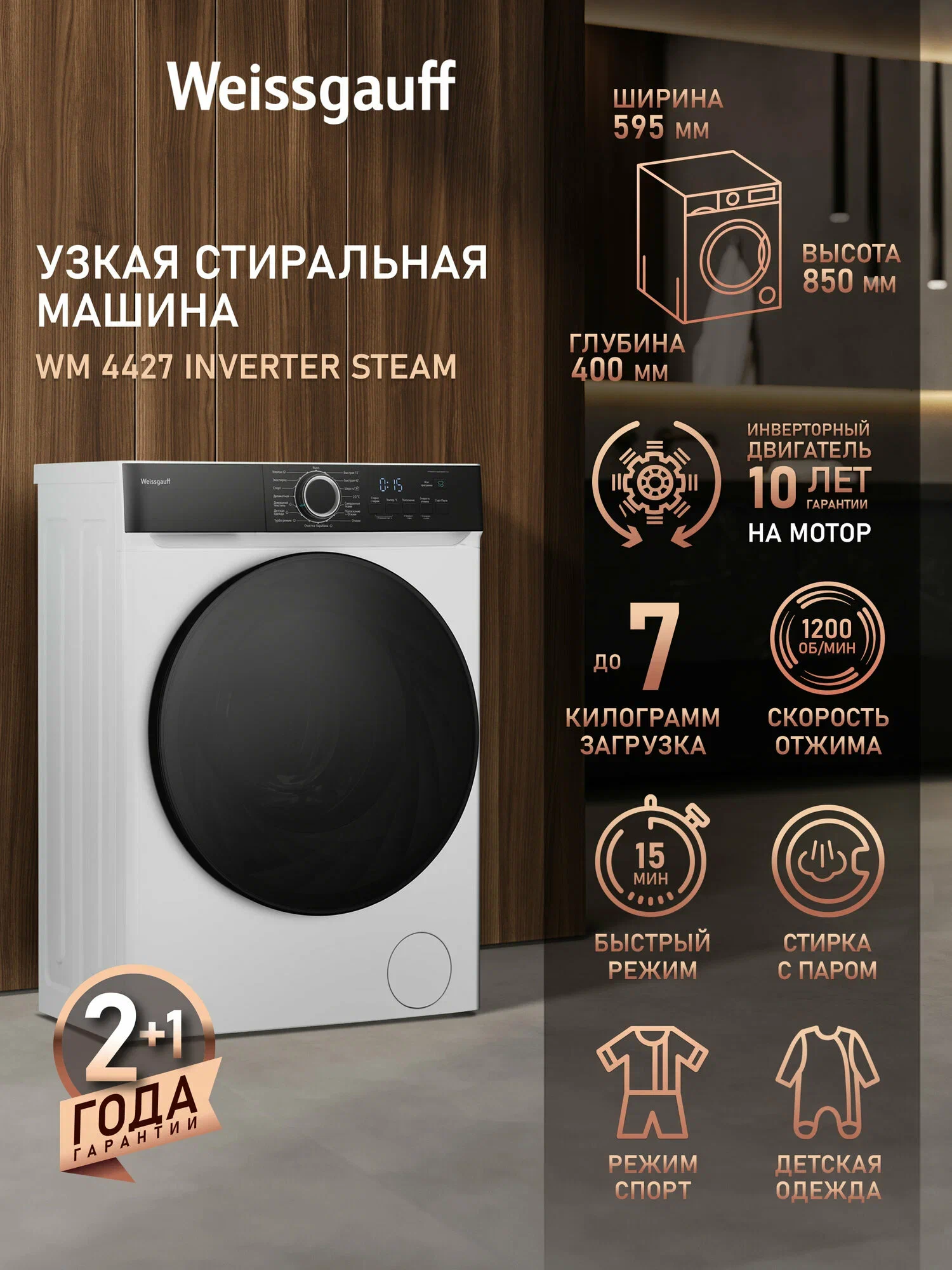 Стиральная машина, глубиной 40см, загрузка 7 кг, отжим 1200об/мин, с инверторным мотором и функцией обработки паром.